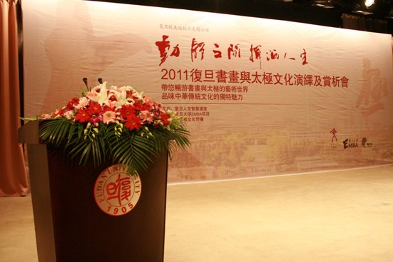 5月21日下午,复旦光华楼2楼400人的报告厅座无虚席,时值复旦大学106周年校庆之际,“复旦人文智慧课堂”携手复旦大学EMBA项目、臻太极文化传播特别推出之校友返校日主题活动“动静之间挥洒人生——2011复旦书画与太极文化演绎及赏析会”隆重举行。传统文化的太极、书法及国画,通过现代的时尚的表现方式,给复旦的校友们带来了极大的文化冲击和视觉上的享受。